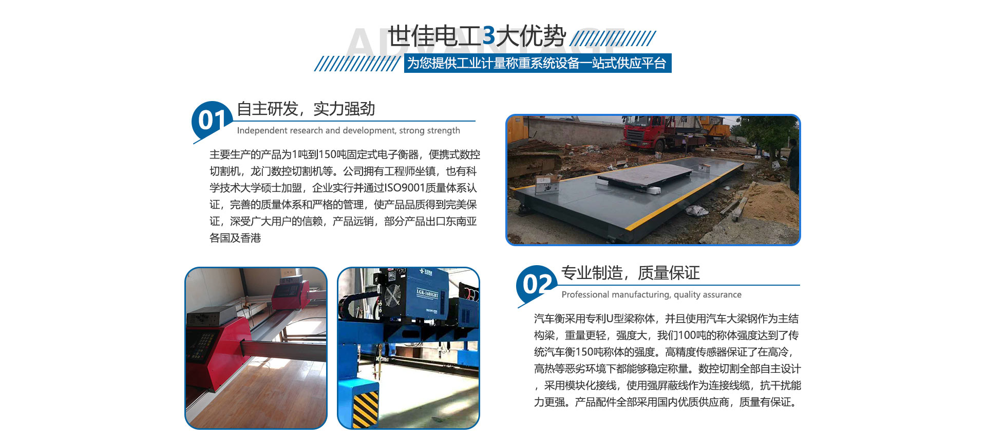 關于我們合肥世佳電工設備有限公司是生產、銷售工業(yè)自動化設備。主要生產的產品為1噸到150噸固定式電子衡器,便攜式數控切割機,龍門數控切割機等。公司擁有工程師坐鎮(zhèn),也有中國科學技術大學碩士加盟,完善的質量體系和嚴格的管理,使產品品質得到保證,深受廣大用戶的信賴,產品各地可售,部分產品出口東南亞各國及香港,數控切割設備也在安徽處于前列。我們并不滿足現在所取得的成就,公司繼續(xù)加大科研投入,正在和中科大物理研究所科研人員共同研究開發(fā)下一代衡器控制儀表,希望以技術作為突破口,將公司做大做強,為中華崛起盡自己一份綿薄之力。歡迎廣大客戶來廠參觀訂貨考察。